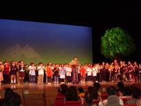 | 県民文化会館の大ホールを埋めた観衆の拍手が鳴り止まない。感動のステージが終了した。いのちのシンフォニー「2001年の樹」のステージのフィナーレは、市民参加の合唱団が「めぐる、いのち」の歌を歌いあげた。 市民から募集した詩に曲をつけて、第4楽章まである組曲を作曲し発表したものだ。17歳の少年の迷えるいのちを、2001年の樹の精が語りかける。 |