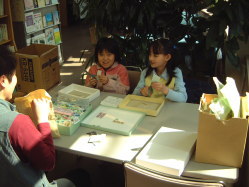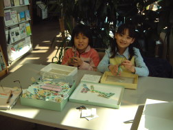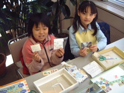 | ↑この前、ボランティアセンターに来た時、古切手や使用済みのテレカを集めることもボランティアだと聞いたので、みんなで集めた切手やテレホンカードを持ってきてくれました。 | ↑古切手の整理をしてくれました。切手の周りをうまく残すのが必要なことを知りました。 |