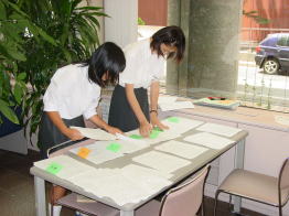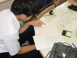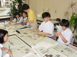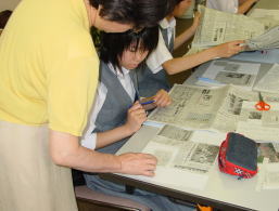 | ↑朗読する材料を見つけ、切り抜きます。視覚障害者の方が興味のある記事ってどんなことかを考え切り抜きます。 | ↑切り抜いた記事を張り合わせて読み方の練習に入ります。 |