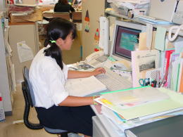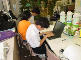 | ↑サマーチャレンジボランティアの応募用紙を整理しています。今年は500人の参加者です。 | ↑参加者のデーターをパソコンに入力 |