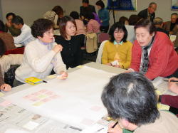 | ↑「できること、やってほしいこと、こんなことがあったらいいな」を考えて、各自でカードに記入します。 | ↑各自のカードを出し合い、同じもののかたまりをつくっていきます。 |