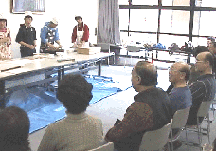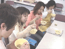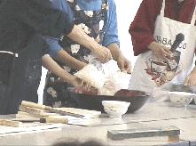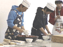 | ●大勢の前でそば打ちの実演 | ●打ち立てのそばは最高です! | ●すみれ会はリフォームのグループです |