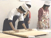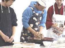 | ●そば粉とつなぎをよくまぜます | ●水を入れてこねます | ●よくこねてまるくします |