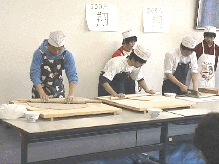 | ●麺棒でのばしはじめます | ●巻き込んでそば打ち | ●円く伸ばしたら粉をふりかけたたみます |