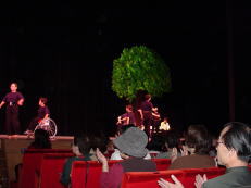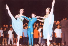 | ↑いのちの精の踊りの、倉石太次郎さんと白鳥バレエ学園の皆さん。 | ↑2001年の樹の前で、さまざまなパフォーマンスが行われた。車椅子ダンスもそのひとつだ。 |