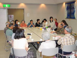 | 街を緑でいっぱいに。地球環境にやさしい朝顔の種もプレゼント。Gグリーンボランティア | 各々の活動の歴史や奥深さにうなづくことばかり。 | ↑やはり最後はこれ、テーブルを囲んでお互いの出来栄えを?交換し合いました。 |