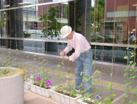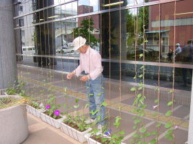 ↑みどりのカーテンの手入れをする、グリーンボランティアの久保田さん