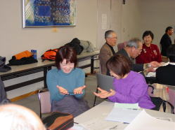 | ↑最初に、ファシリテーターの内山さんからワークショップのねらいについて説明を受けます。 | ↑グループ分けのあとは、グループ内のコミュニケーションを図ります。これは、シャボン玉送りです。 |