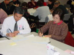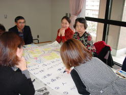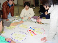 | ↑「できること、やってほしいこと、こんなことがあったらいいな」を考えて、各自でカードに記入します。 | ↑各自のカードを出し合い、同じもののかたまりをつくっていきます。 |